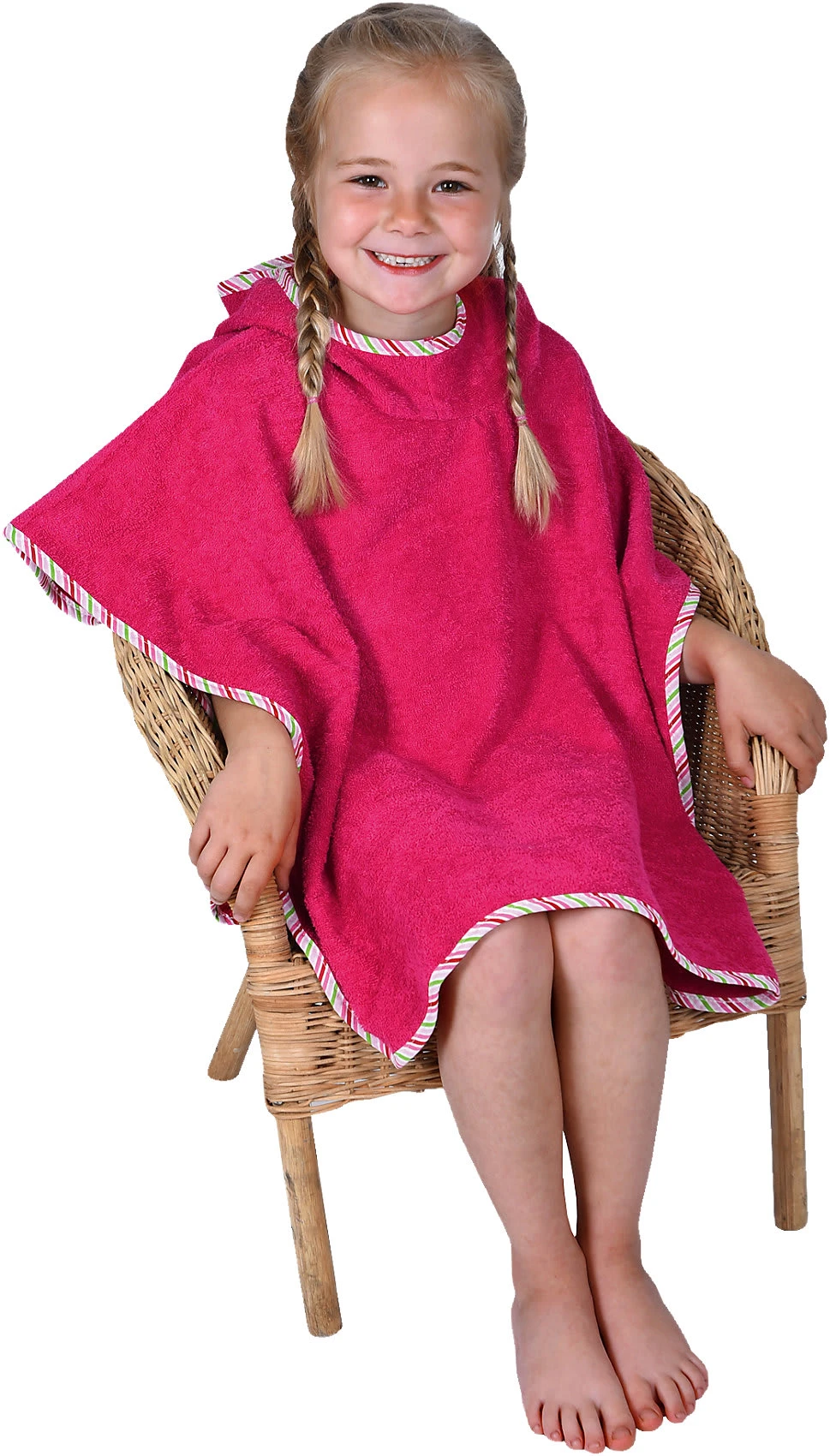 Raus aus dem Wasser und rein in den kuscheligen Badeponcho! Die flauschige Frotteeware umhüllt den kleinen Kinderkörper warm und weich. Die Kapuze schützt auch den Kopf vor Zugluft. So machen Baden und Abtrocknen gleich noch viel mehr Spaß. Das hübsche Design mit gestreift eingefassten Kanten sorgt für eine besonders hübsche Optik.
