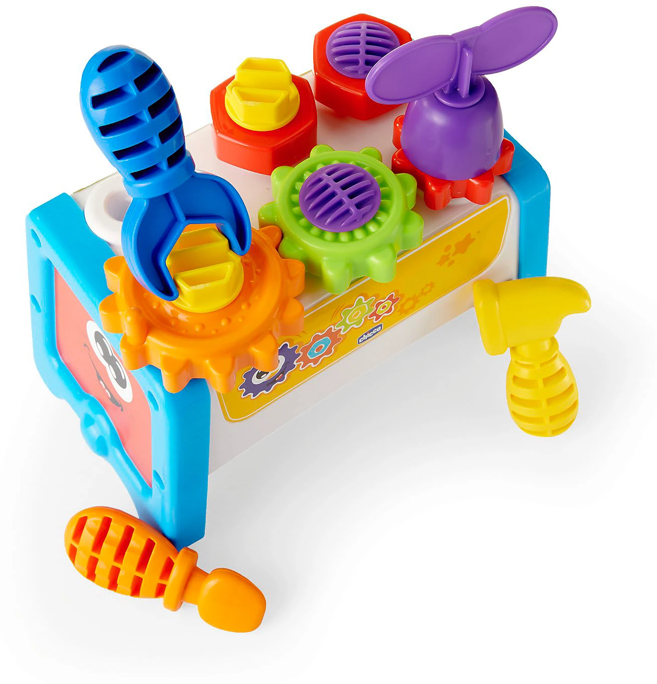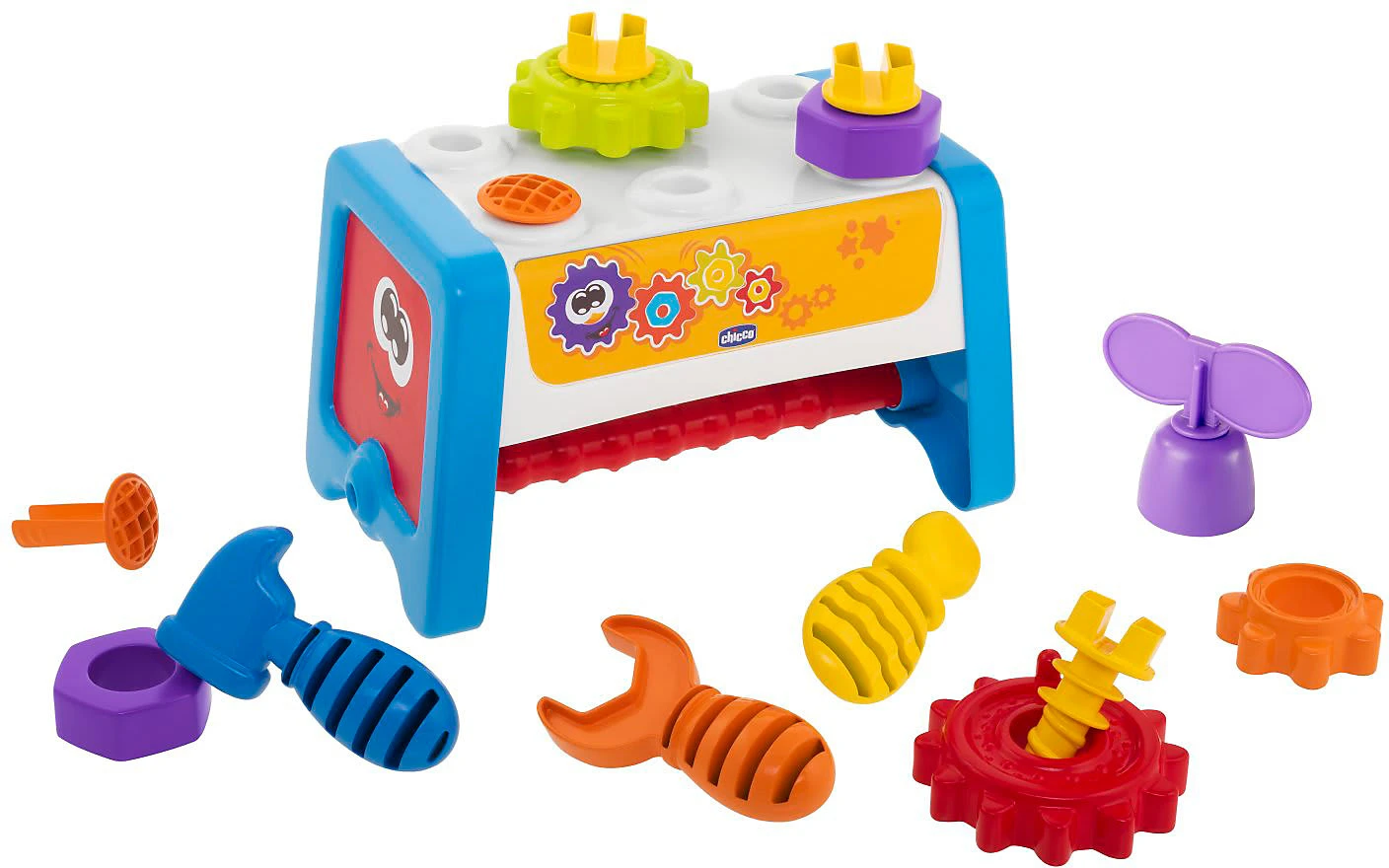 Mit dieser bunten 2 in 1 Werkbank können die motorischen Fähigkeiten geübt und die ersten Erfahrungen im logischen Denken gesammelt werden. Die Zahnräder können in die richtige Reihenfolge gesetzt werden, damit sich anschließend der Propeller dreht. Am Ende des Spiels können die Kinder die Werkbank drehen und als Werkzeugkasten verwenden. So kommen sie das erste Mal spielerisch mit Werkzeugen wie Hammer, Schraubenzieher, Nägeln und vielem Mehr in Berührung