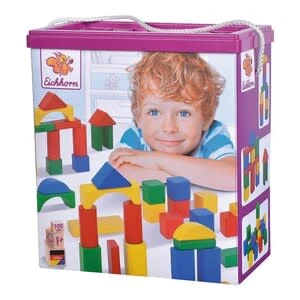 Perfekt für kleine Nachwuchs-Architekten: Die bunten Holzbausteine von Eichhorn animieren den Nachwuchs dazu, fantasievolle Bauwerke zu errichten. Holzbausteine von Eichhorn Aufbewahrungsbox mit Deckel und Kordel, 100 Bauklötze in verschiedenen Formen und Farben ab 12 Monaten Made in Germany Mit dem Set von Eichhorn stehen dem Nachwuchs gleich 100 bunte, aus nachhaltigem Buchenholz gefertigte Bausteine zur Verfügung. Kinder ab zwölf Monaten können die verschiedenen Klötze zu kreativen Bauwerken stapeln oder sie nach Farben oder Formen sortieren. Haben die kleinen Baumeister genug gespielt, lassen sich die einzelnen Steine wieder in der praktischen Aufbewahrungsbox mit Deckel verstauen. Auf spielerische Art und Weise schult die Beschäftigung mit den Bauklötzen die Feinmotorik und Hand-Auge-Koordination des Kindes. Die Minis können mit den buten Designs Farben und Formen lernen und das Prinzip von Ursache und Wirkung entdecken: Versetzt man dem Bauwerk einen Schubs, fällt es mit einem lauten Geräusch, in sämtliche Einzelteile zerlegt zu Boden.