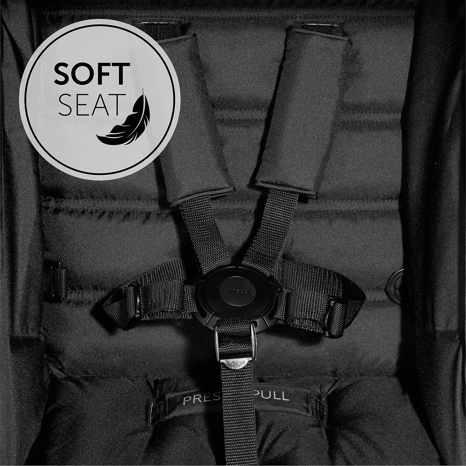 Der Sitz kann in eine bequeme Liegeposition gebracht werden, wenn es Zeit für ein Nickerchen wird. Dafür wird die Lehne ganz einfach mit nur einer Hand verstellt. Das große Verdeck kann bei Bedarf abgenommen werden. Damit auch der Komfort der Eltern nicht zu kurz kommt, kann der Schiebegriff verstellt und so an die Körpergröße der schiebenden Person angepasst werden.