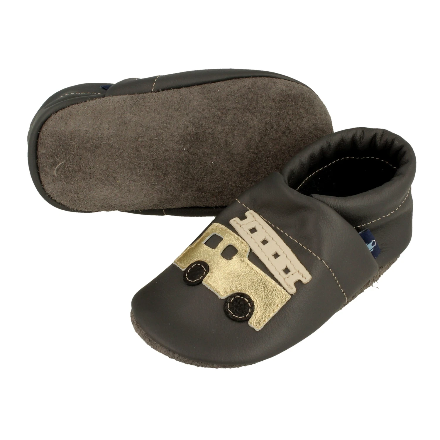 Krabbelschuhe / Lederpuschen Mit Feuerwehr In Grau / Gold