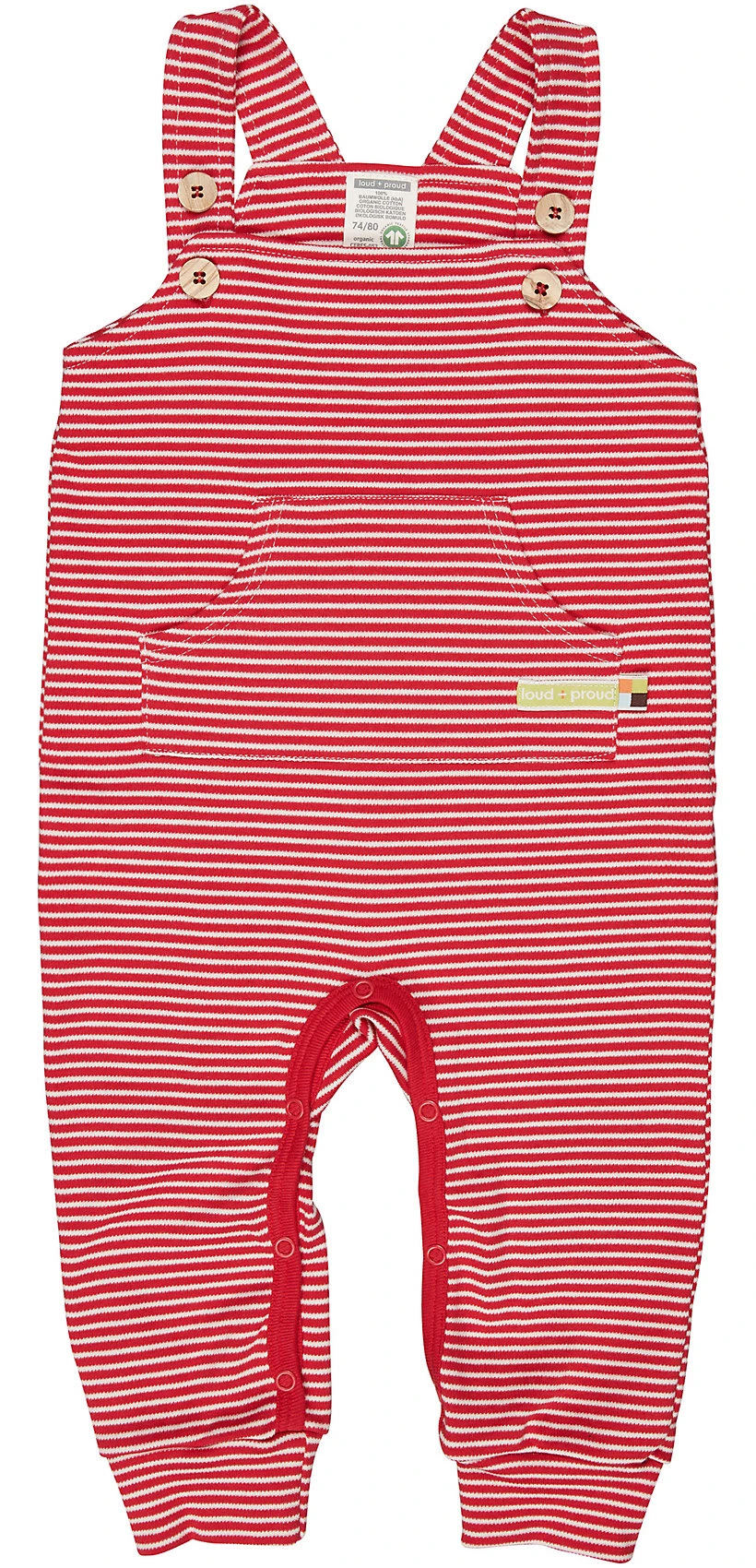Weiche Latzhose aus Interlock-Jersey. Verstellbare Träger mit Holzknöpfen. Schrittnaht mit Druckknopfverschluss. Saum mit Bündchen. Vorne aufgesetzte Tasche mit seitlichem Logo-Etikett und Fähnchen. Made in Hungary. Waschbar bei 30°C