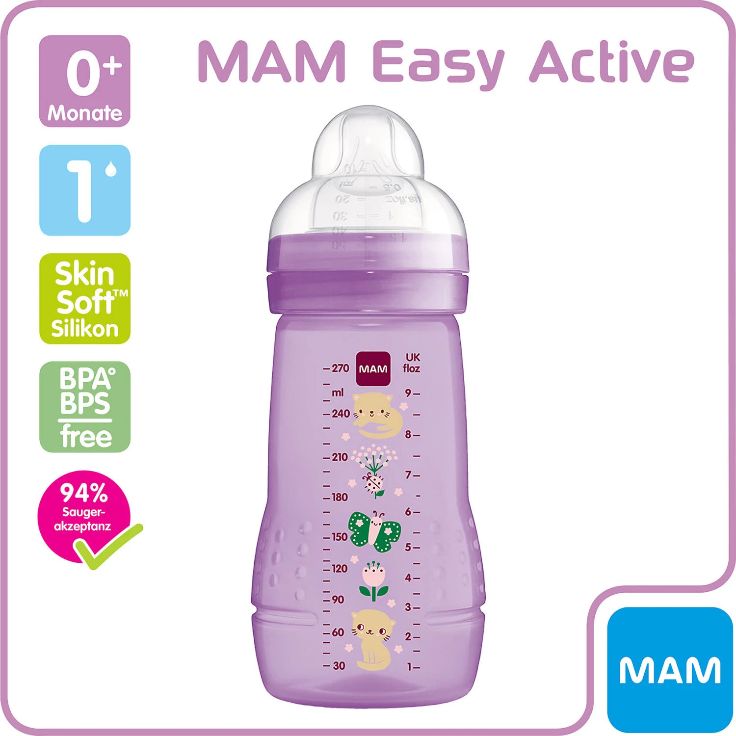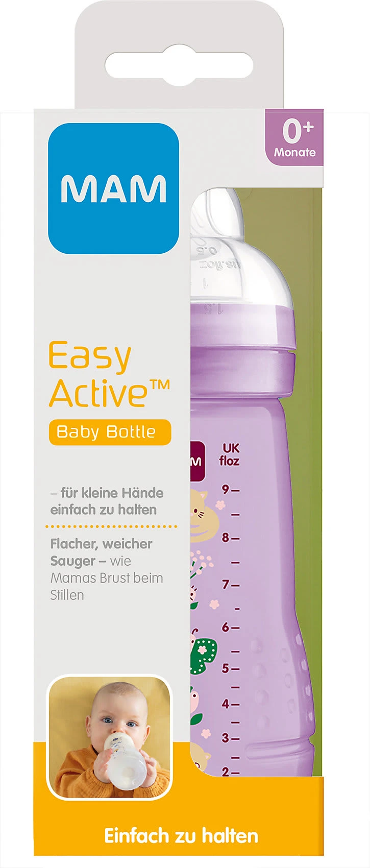 Die MAM Easy Active Weithalsflasche im Lieblingsdesign ist mit einem flexiblen Sauger aus besonders weichem Silikon ausgestattet, was es dem Baby erleichtert, das Fläschchen zu akzeptieren. Die Easy Active Flasche eignet sich daher auch ideal für den Übergang vom Stillen zur Flasche.