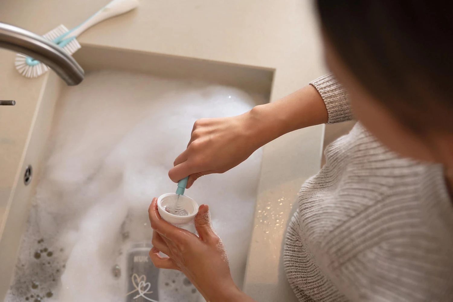 Die NUK Flaschenbürste eignet sich zur gründlichen Vorreinigung von Trinksaugern und Fläschchen durch ein sich anpassendes Bürstenprofil und formstabile Borsten. Der Schwammkopf schmiegt sich leicht an und reinigt besonders gründlich auch in schwer zugängliche Stellen. Mit der zusätzlichen Saugerbürste im Griff lassen sich auch Trinksauger optimal reinigen.