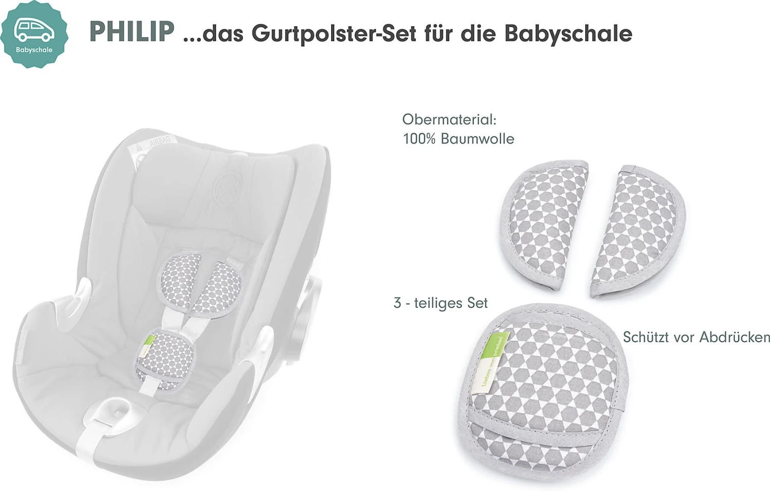 PHILIP, das Gurtpolster-Set von priebes für die Babyschale! Perfekter Begleiter für unterwegs: die Polster von PHILIP passen an die Gurte der meisten handelsüblichen Babyschalen, sehen toll aus und schützen das Baby vor Druckstellen durch den Gurt.