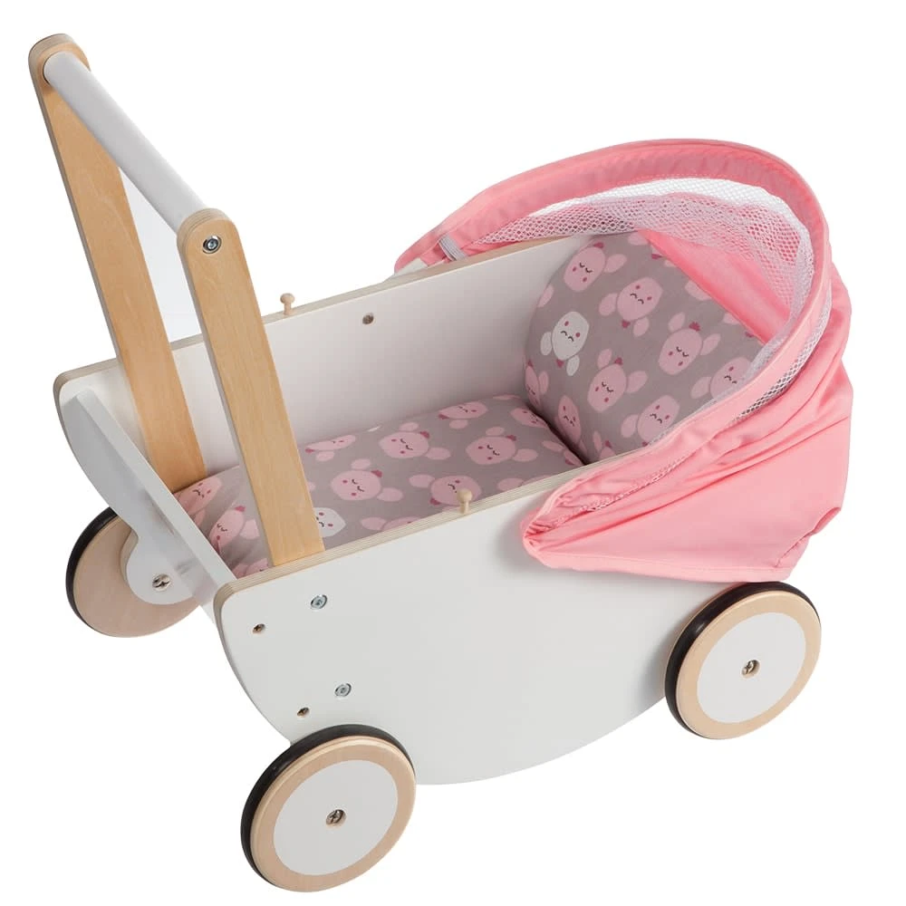 Holzspielzeug Puppenwagen „Cozy Cactus“Mit dem stylischen weißen Puppenwagen „Cozy Cactus“ von howa können Kinder die Lieblingspuppe oder den Stoffbären transportieren. Besonders auffällig ist das liebevolle Design mit hohem Griff und rosa Verdeck. Im Inneren des Puppenwagens aus Holz befindet sich eine gemütliche Matratze und eine Decke im hübschen Kaktus-Design.
