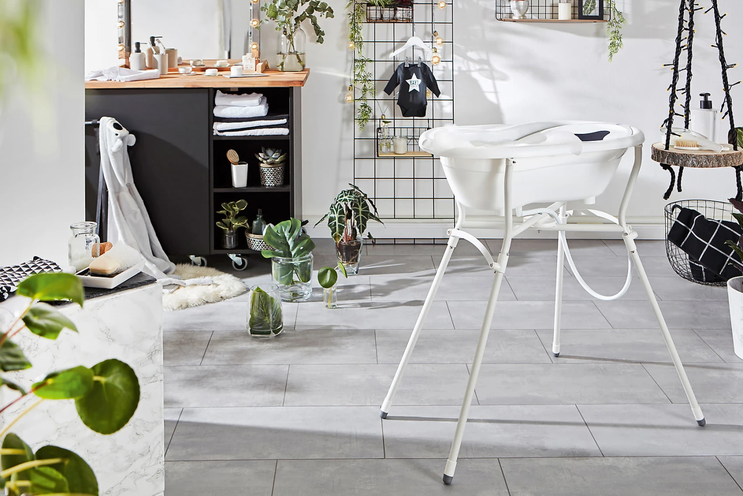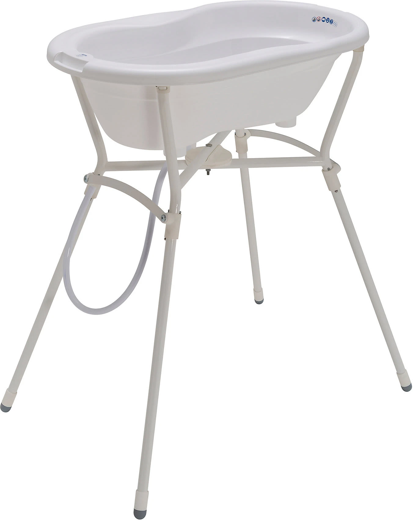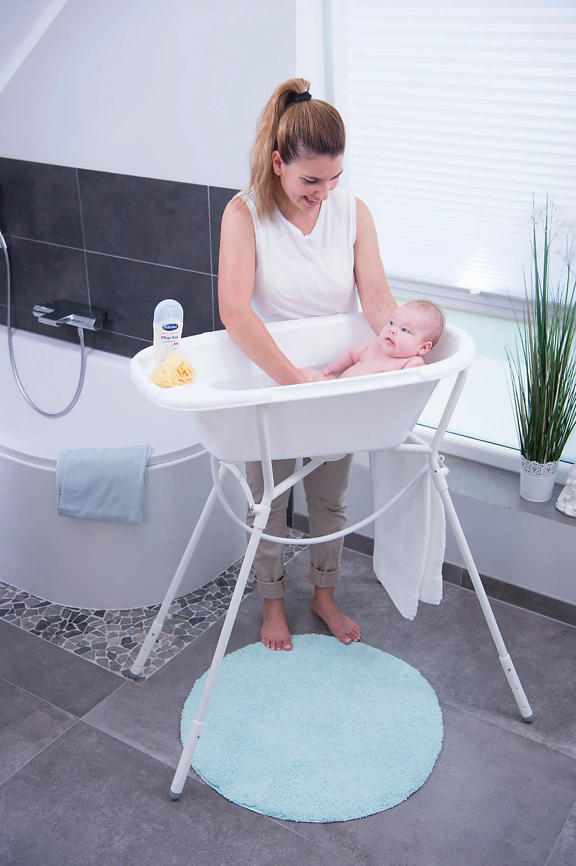 Das vierteilige Set von ROTHO BABYDESIGN besteht aus Badewannenständer, Badewanne, Badewanneneinsatz und Ablaufschlauch. Der solide Ständer bietet Kippsicherheit nach allen vier Seiten. Zwei Handtuchhalterungen sorgen dafür, dass die Handtücher stets griffbereit sind.